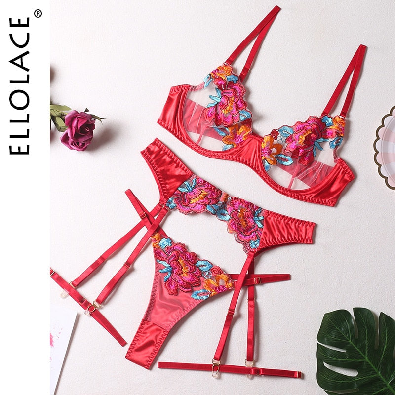 Ellolace Floral Erotic Lingerie Set Woman 3 Pieces Transparent Lace Blue Sexy Underwear Fancy Beautiful Thongs Breves Sets
