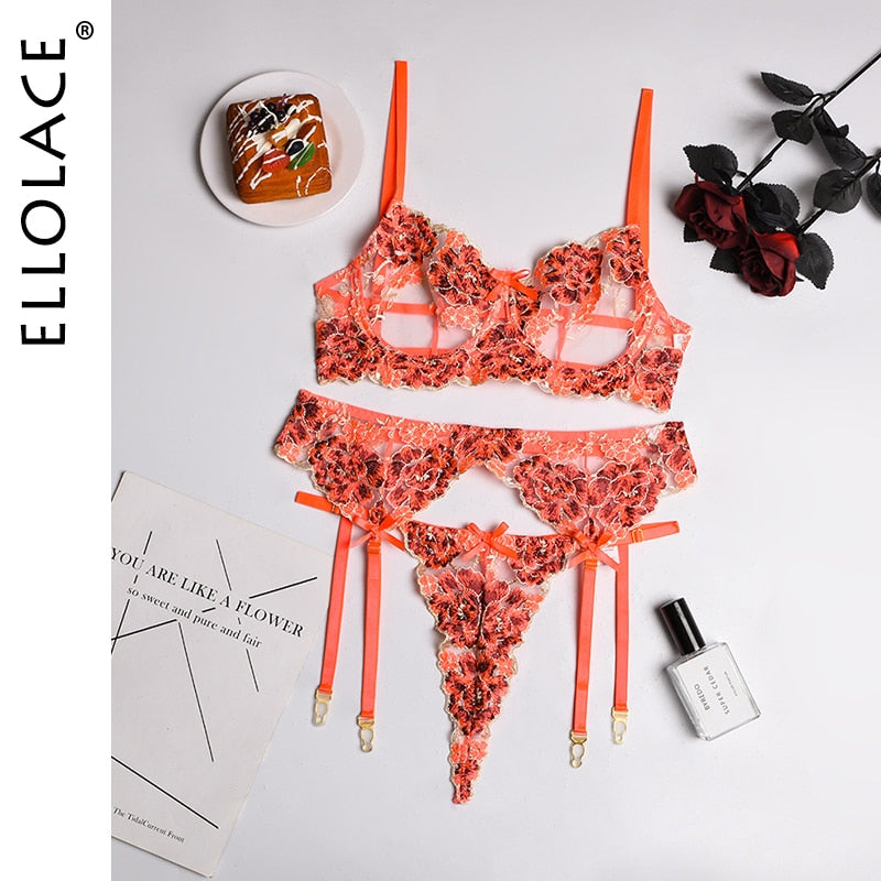 Ellolace Floral Lingerie Underwear 3 Piece Set Sexy Transparent Short Skin Care Kits Lace Underwire Bra and Thongs Brief Sets