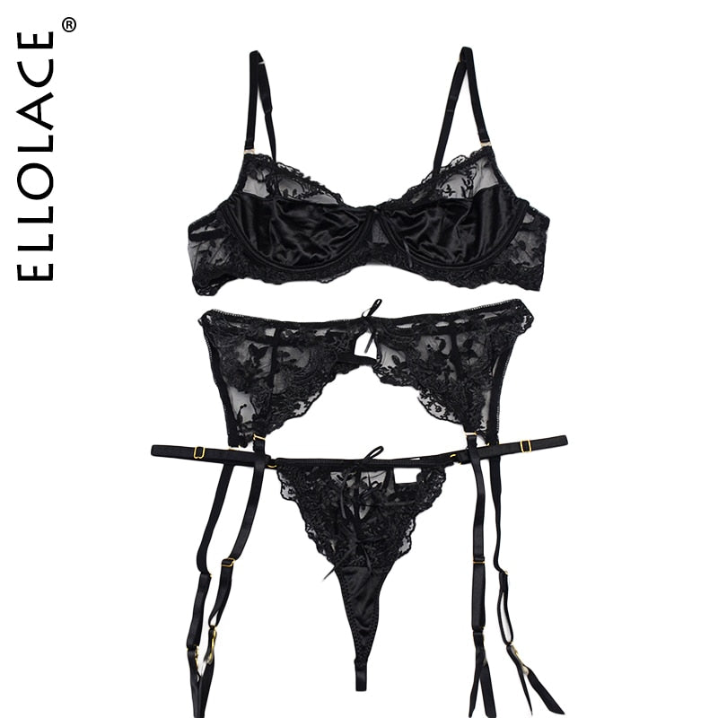 Ellolace Lace Lingerie Embroidery Women's Underwear Transparent Erotic Push Up Bra And Panty Set Black Fancy Garters Intimate