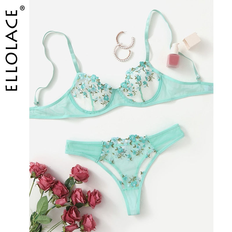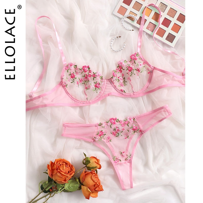 Ellolace Lingerie Sexy Floral Embroidery Underwear Transparent Lace Short Skin Care Kits Delicate Fairy Set Woman 2 Pieces