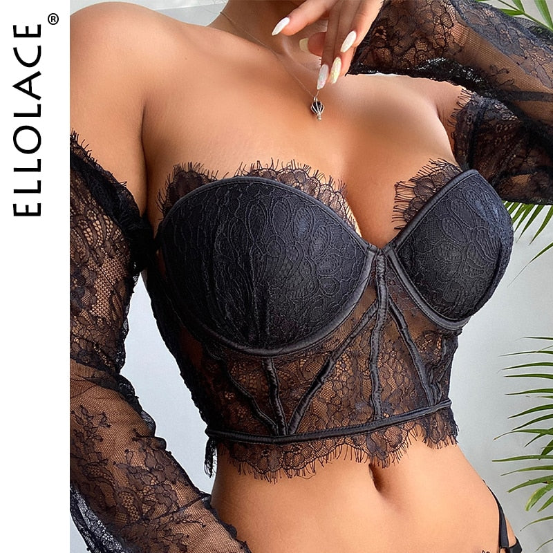 Ellolace Off Shoulder Tops Sensual Lingerie Bralette Hot Sexy Long Sleeve Women's Underwear Transparent Underwire Padded Bra