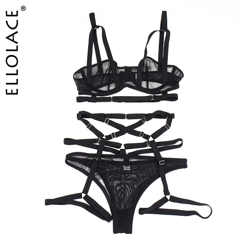 Ellolace Sensual Lingerie Bandage Transparent Erotic Underwear 3 Piece Bilizna Set Underwire Bra Garters Briefs Sexy Intimate