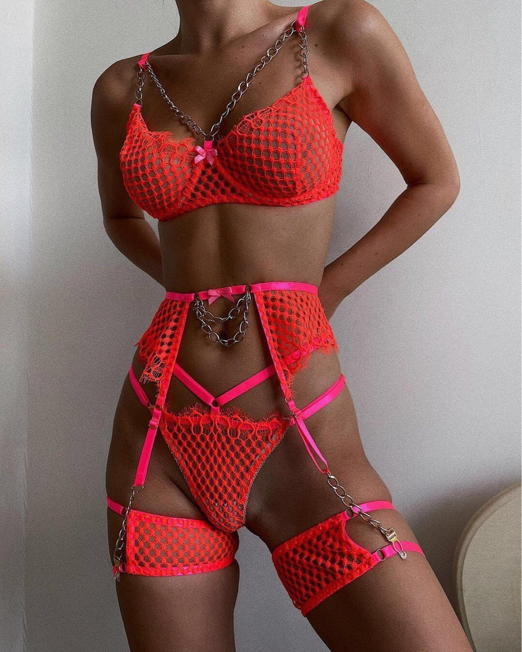Ellolace Sensual Lingerie Lace Bra With Chain 4-Piece Transparent Underwear Set Girl Sex Bomb Costume Erotic Luxury Outfits