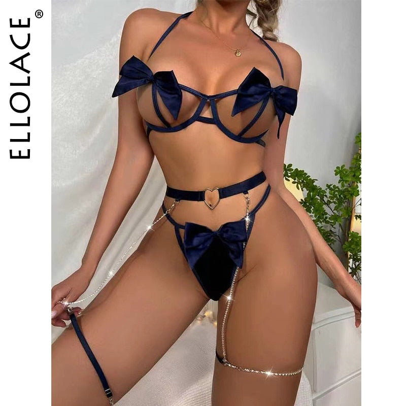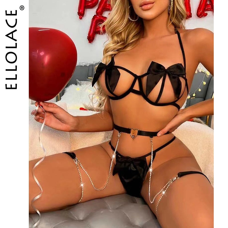 Ellolace Sensual Lingerie Woman Hollow Out Bowknot Exotic Costumes Halter See Through Bra Porn Sissy 3-Piece Red Erotic Sets