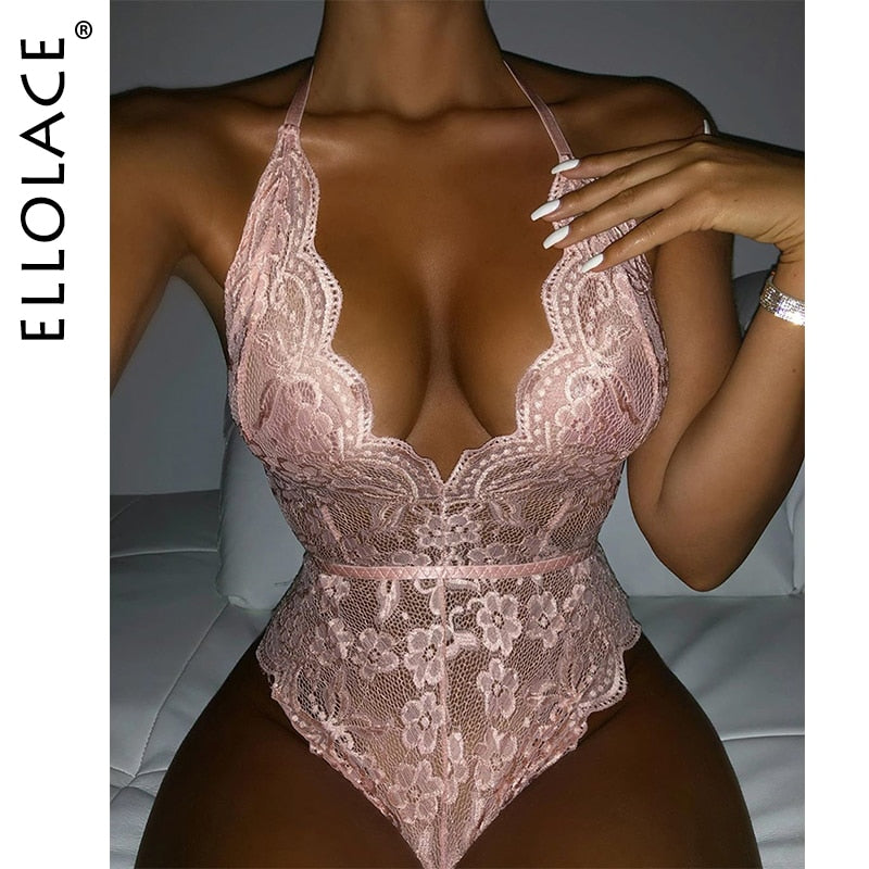 Ellolace Sexy Bodysuit Women Lace Deep-V Bodycon Bodys Halter Transparent Mesh Sleeveless Bodysuit Underwear Solid Backless Top
