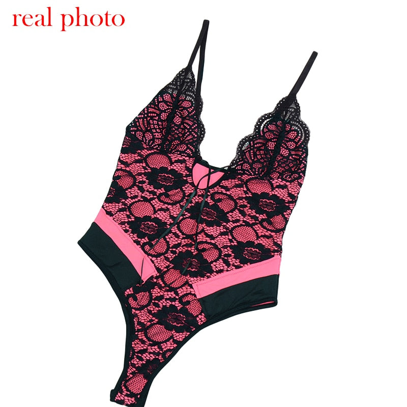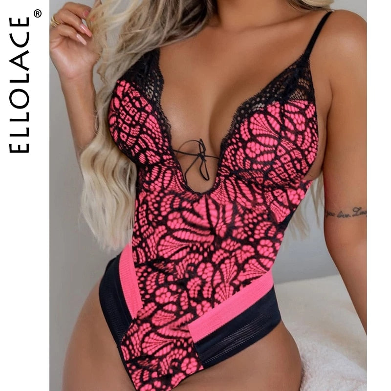 Ellolace Sexy Deep-V Lace Bodysuit Patchwork Bodycon Backless Bodies For Women Summer Sleeveless Pink Sexy Fitness New Top