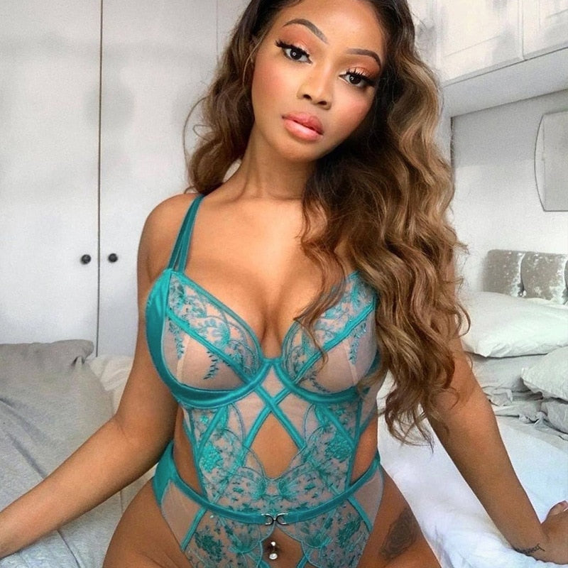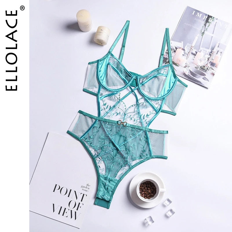 Ellolace Sexy Lace Bodysuit With Crotch See Through Hollow Out Embroidery Lingerie Sheer Body Underwire Mesh Bodycon Top