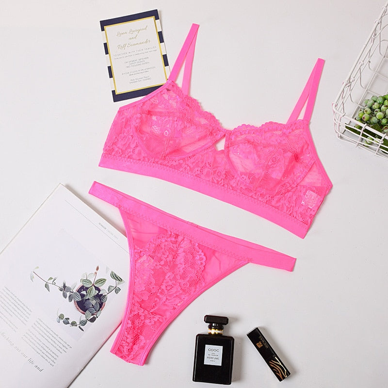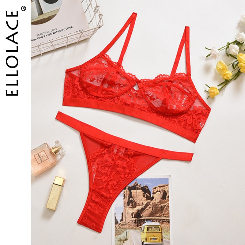 Ellolace Sexy Lace Lingerie Women's Underwear Sensual Solid Brief Sets Wireless Transparent Bra And Panty Exotic Bilizna Set