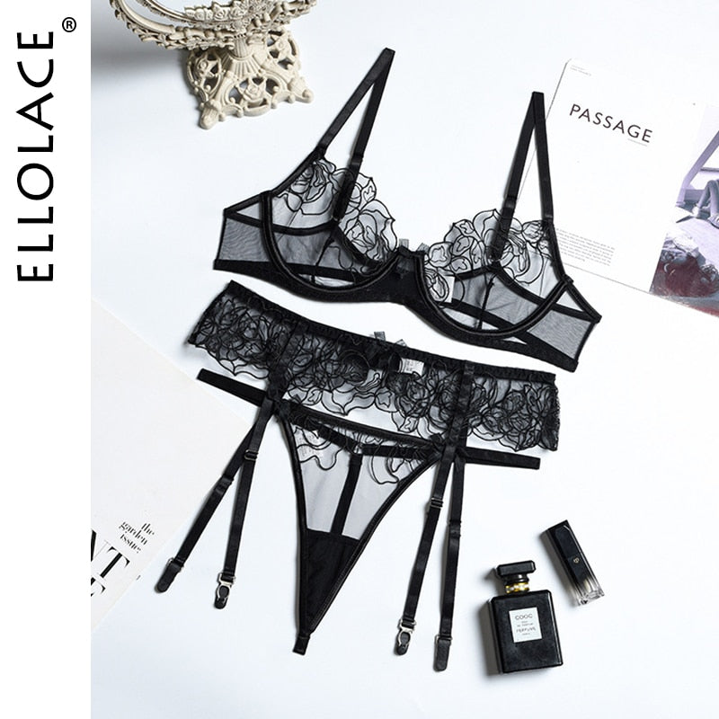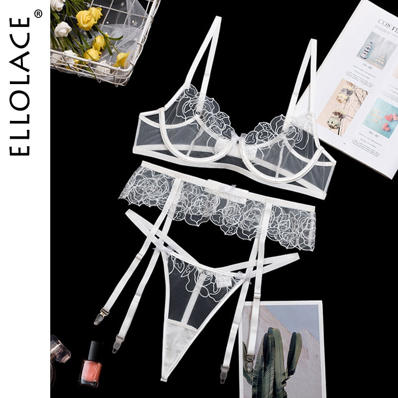 Ellolace Sexy Lingerie Women's Underwear See Through Sensual Lingerie Woman Exotic Costumes Bra with Bones Lingerie 3 Pieces