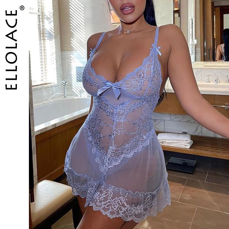 Ellolace Sexy Night Dress Women Sleepwear Lace Nightdress Mini Nightwear Sky Blue Nightie Nightgown with Thongs Home Cloth 708-1