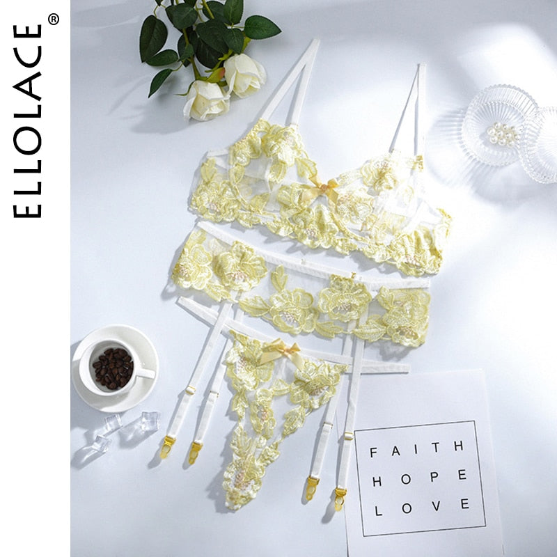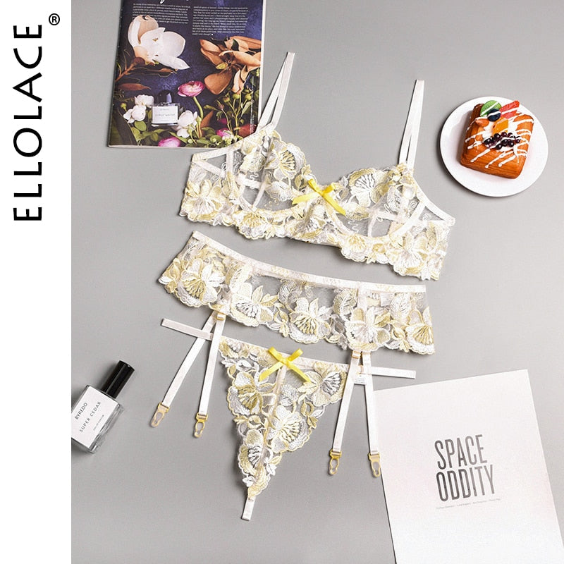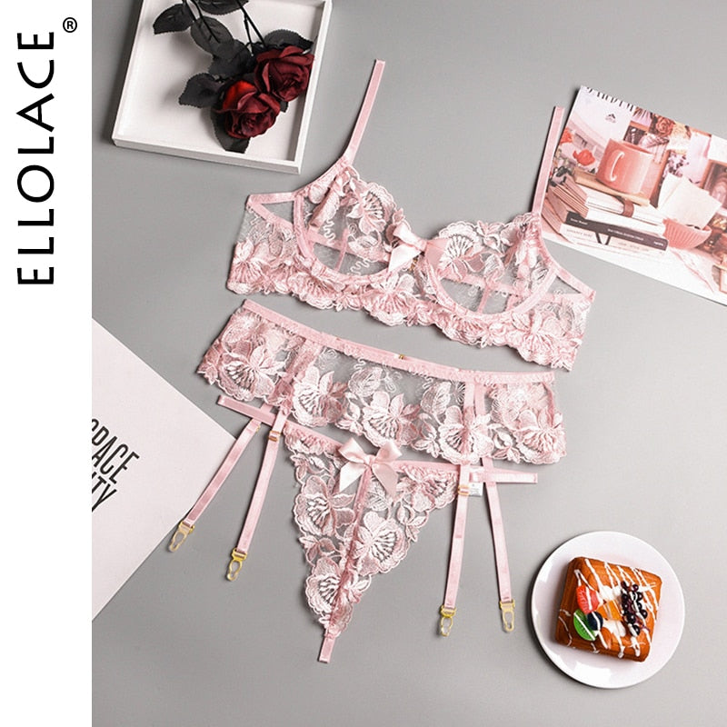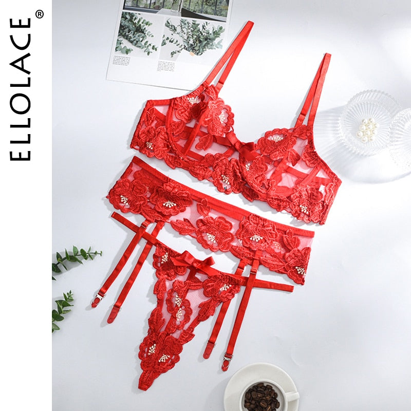 Ellolace Sexy Sensual Lingerie Floral Embroidery Erotic Underwear Underwire Short Skin Care Kit Garters Thongs Red Brief Sets