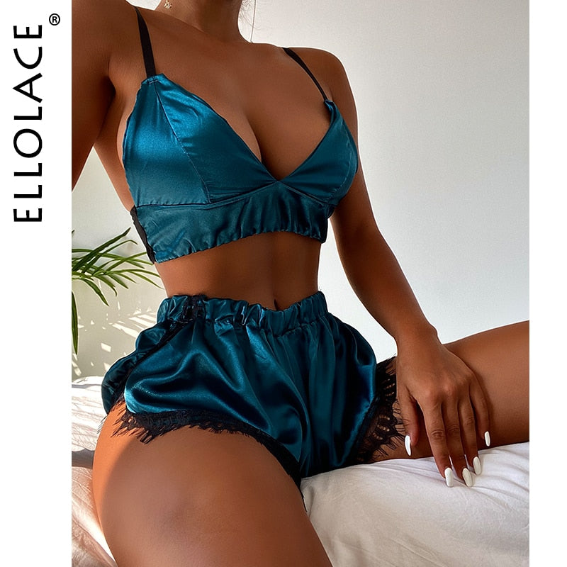Ellolace Sexy Women's Pajamas Lace Satin Silk Patchwork Bra Suits With Shorts Sleepwear Set Woman 2 Pieces Home Suit Nightwear