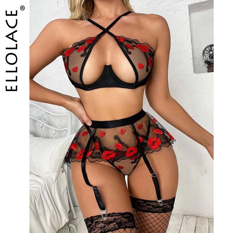 Ellolace Valentine Lingerie Red Lip Embroidery Exotic Costumes Transparent Halter Porn Underwear Sexy Outfits Sissy Erotic Sets