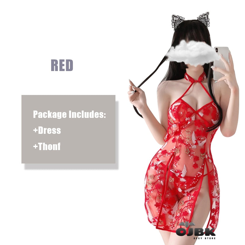 Embroidery Backless Cheongsam Nightwear Female Vintage Split Tempatation Erotic Costume Women's Suit Perspective Lingerie Dress