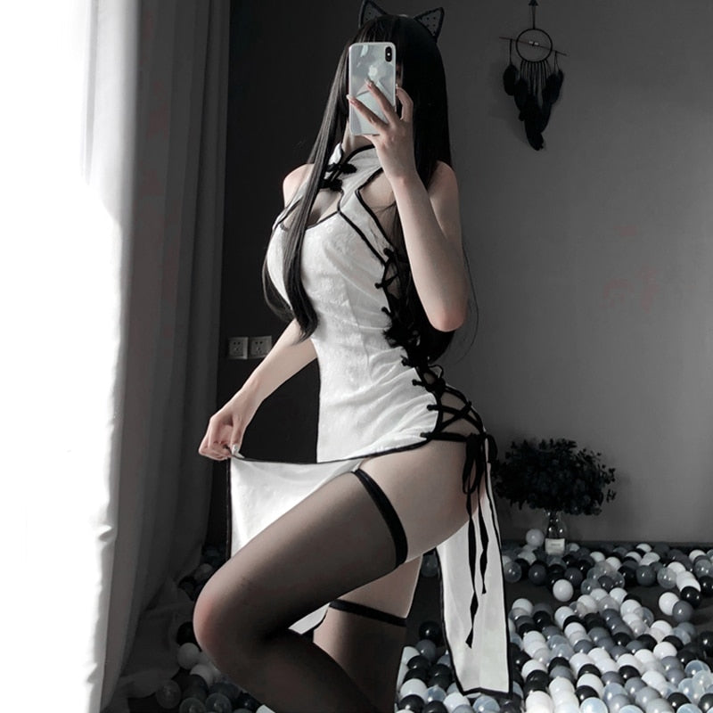 Erotic Anime Cosplay Costume Black and white Ladies Dress Women Lace Outfit Fancy Slim Fit Open Chest Uniform Sexy Cheongsam