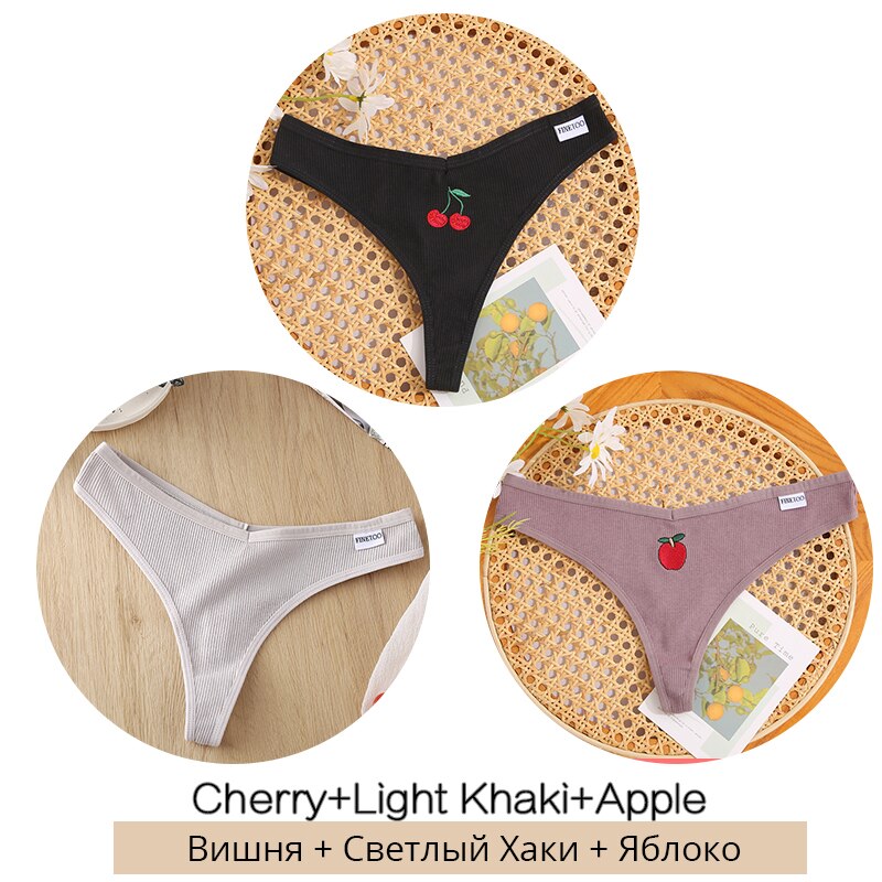 FINETOO Fruit Embroidery Thongs Women Cotton T-back Underpants M-XL Ladies G-string Sexy V Waist Underwear Bikini Panty Lingerie