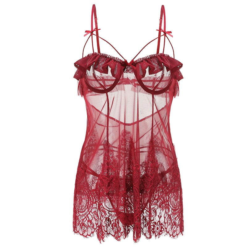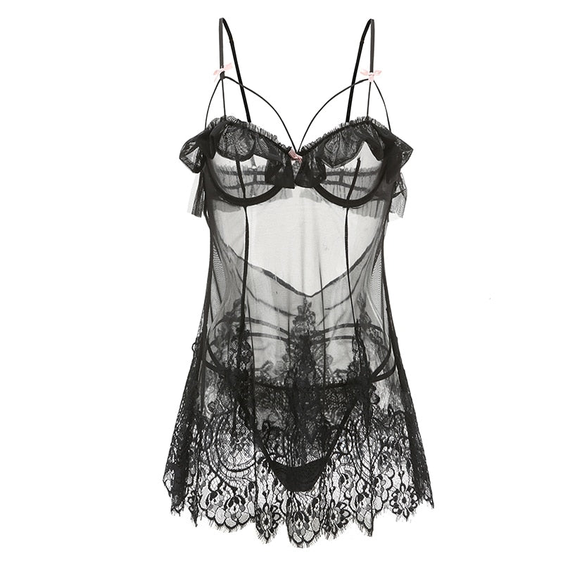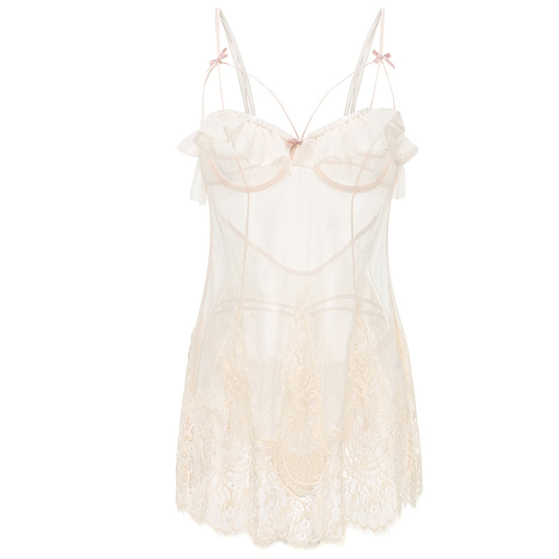 French Sexy Pyjamas Summer Lace Ruffles Small Chest Perspective Sling Sleeping Dress 2PCS Pajama Set for Women Dropshipping