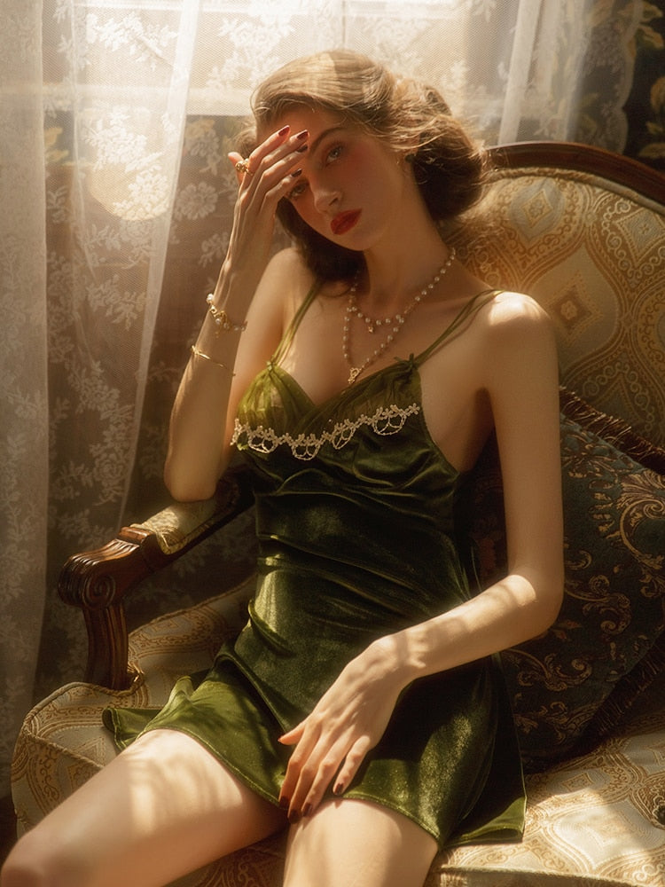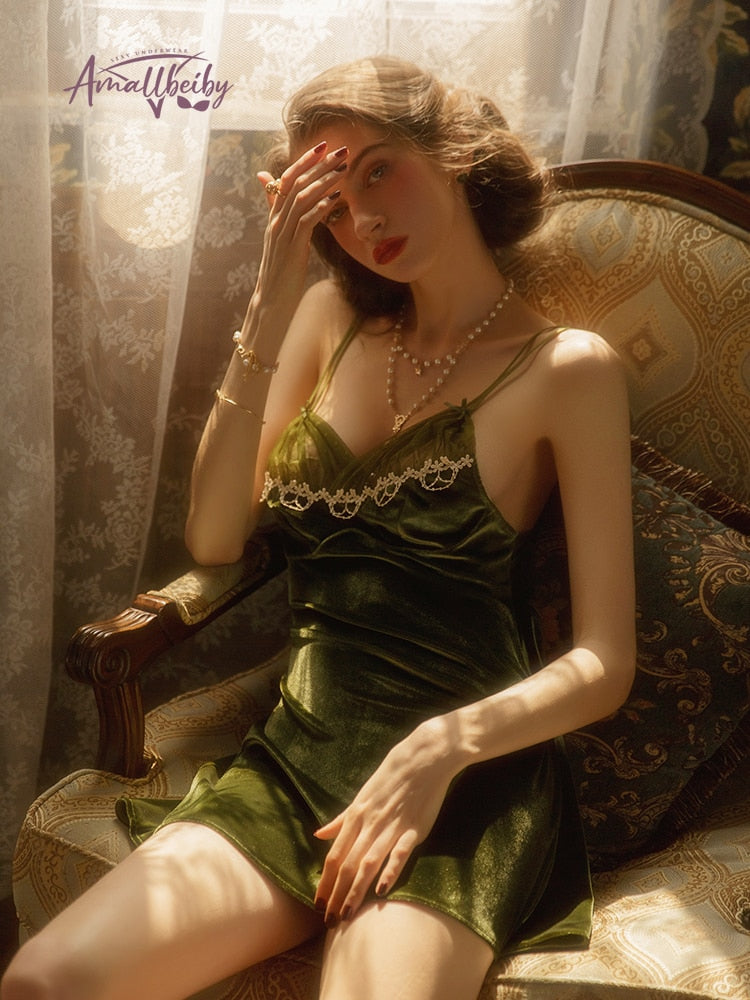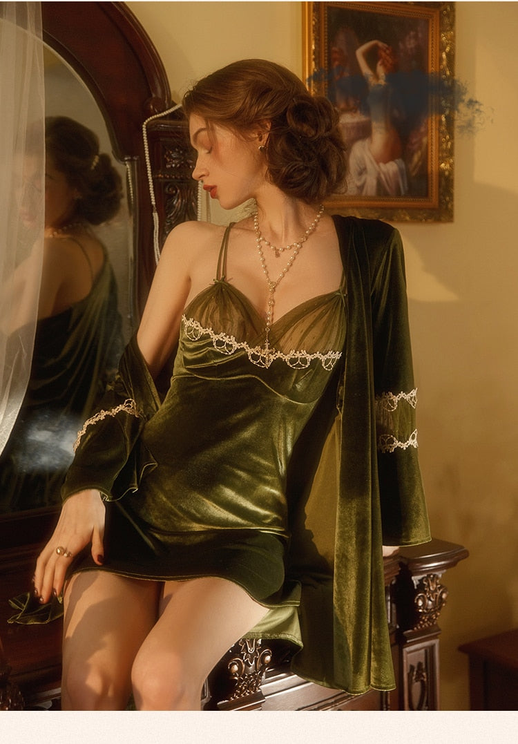 French Sexy Velvet Pajamas for Women V-neck Hollow Lace Sleepwear Pajama Set Winter Warm Sling Nightdress Female Nightwear