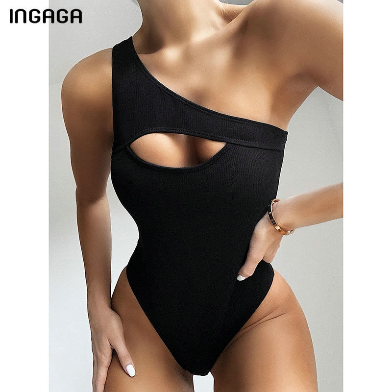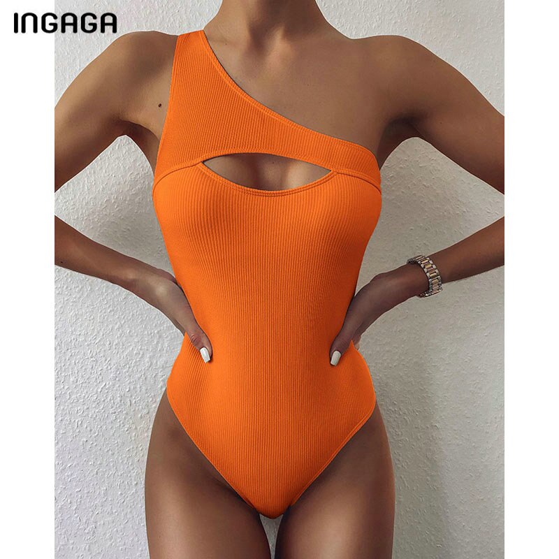 INGAGA Sexy One Shoulder One Piece Swimsuit Cut Out Swimwear Women 2022 Ribbed Bodysuit Solid Beachwear High Cut Bathing Suits