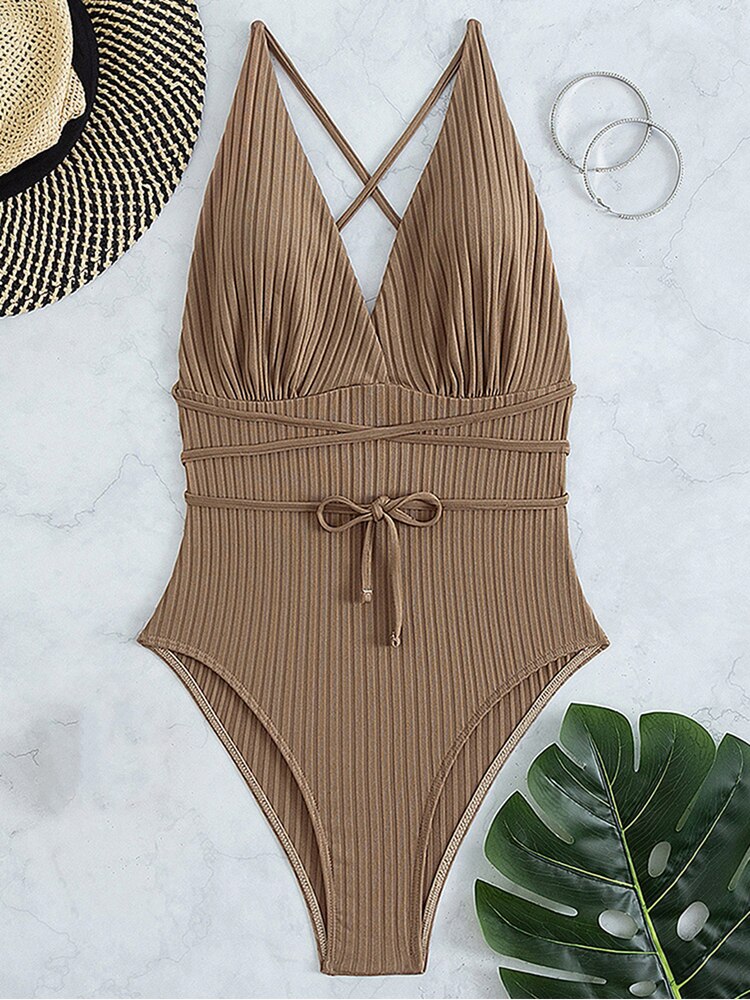 INGAGA Sexy Plunging One Piece Swimsuit Ribbed Swimwear Women 2022 New Crisscross Bodysuit Backless Monokini Solid Bathing Suits