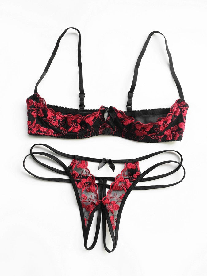 Lovers' Underwear Lace Seductive Women Hollow Out Chest Ultra-thin Underwire Bra Panty Garter Lingerie Set Intimate Clothes