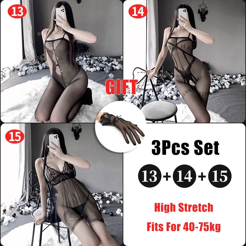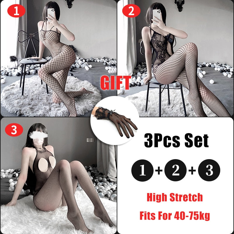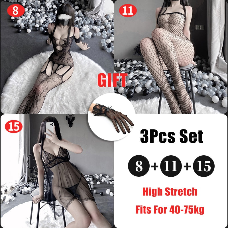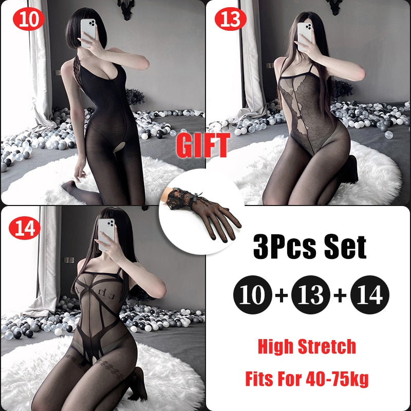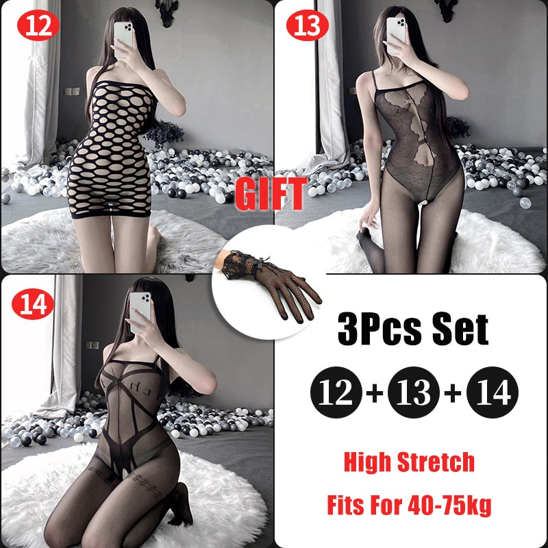 OJBK 3Pcs Sexy Lingerie Set Open Crotch Stretch Mesh Body Stockings 15 Style Teddies Bodysuit Erotic Outfit Plus Size Underwear