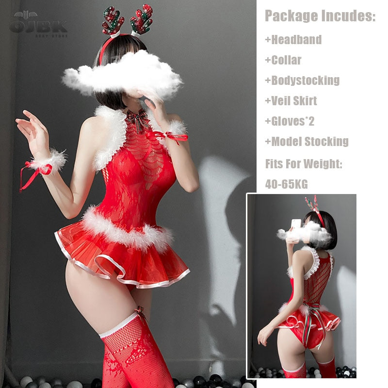 OJBK Christmas Cosplay Costumes Hollow out Outfit Temptation Elk Headband Sexy Lingerie For Women Bra Set Red Fishnet Bodysuit