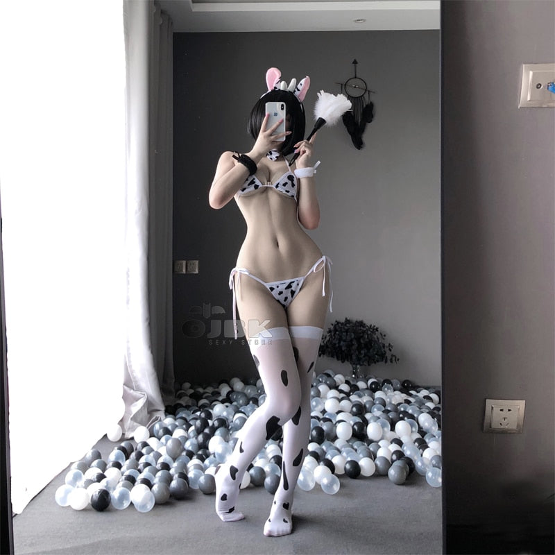 OJBK Cow Sexy Cosplay Costume Maid Tankini Swimsuit Anime Bikini Set Girls Swimwear Clothing Lolita Bra and Panty Set Stockings