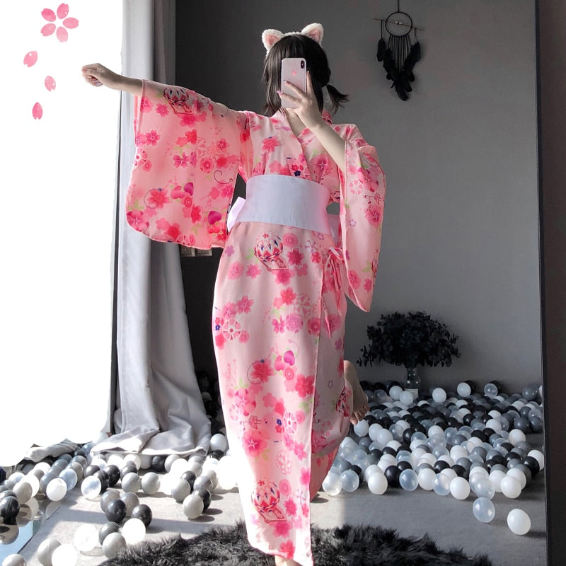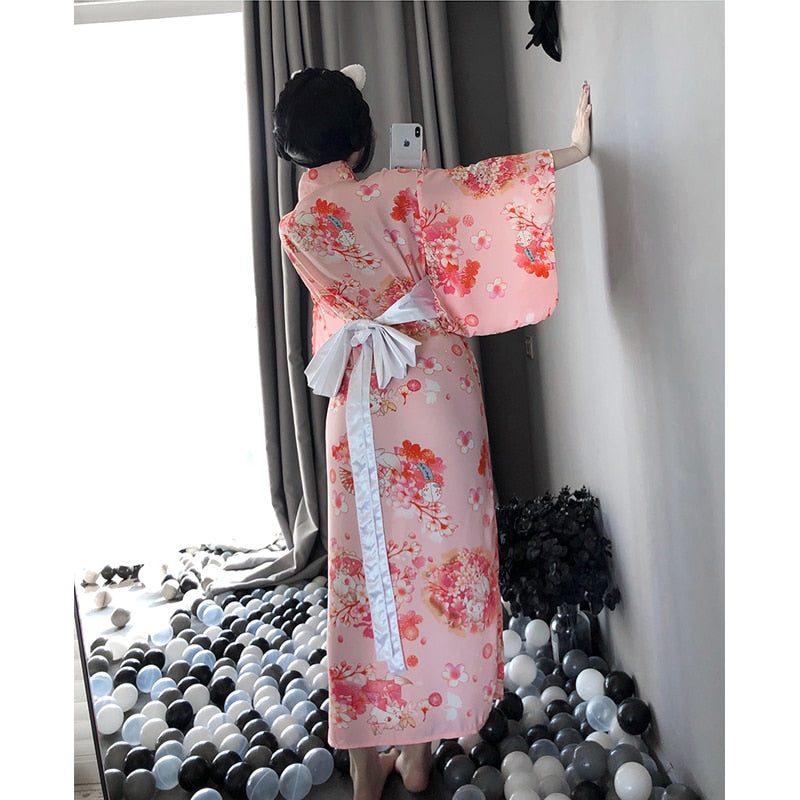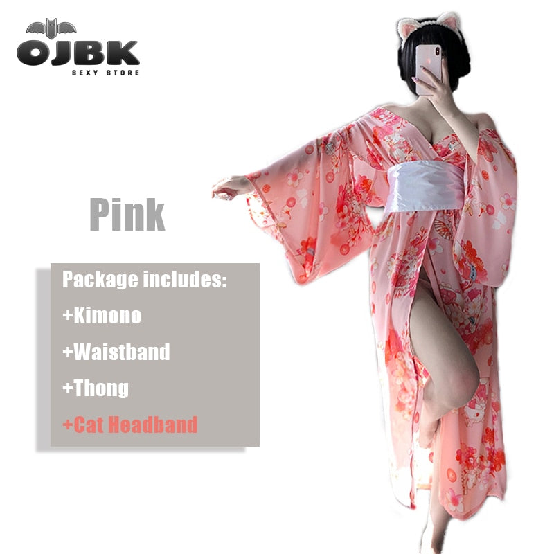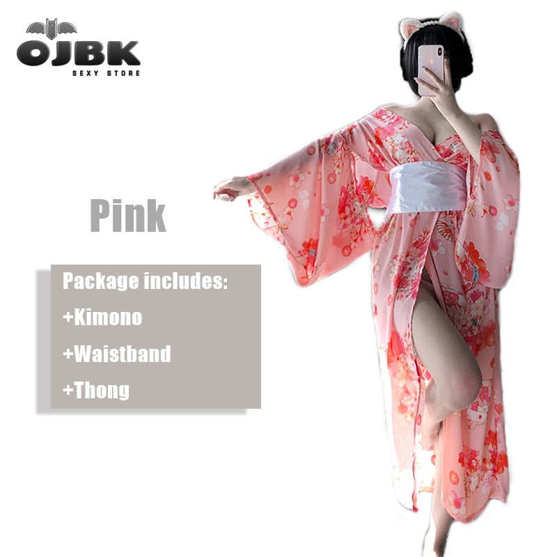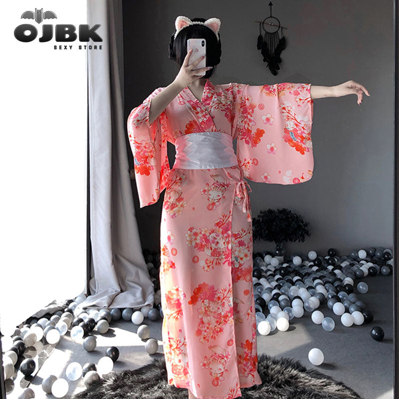 OJBK Japanese Kawaii Pink Kimono White Bow-Knot Waistband Thong Sexy Lingerie Cosplay Costumes Woman Yukata Robe With Obi Belt