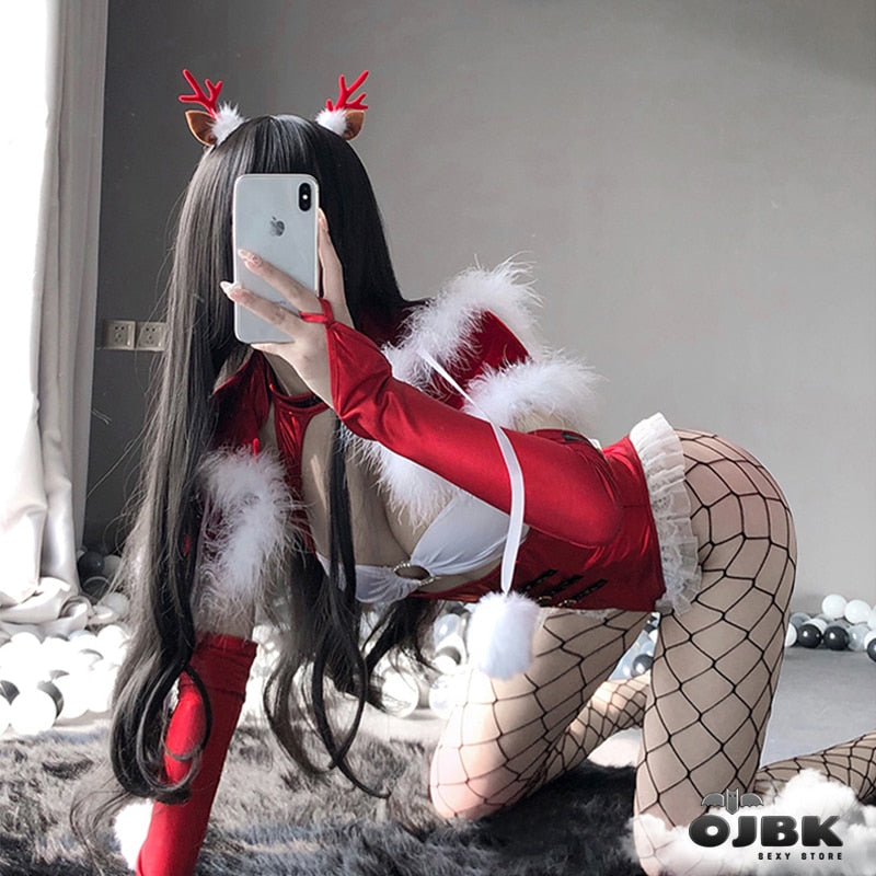 OJBK Red Christmas Princess Cosplay Costumes Sexy Bodysuit With Shawl Gloves Stocking Open Chest Outfit Temptation Anime Hot Set