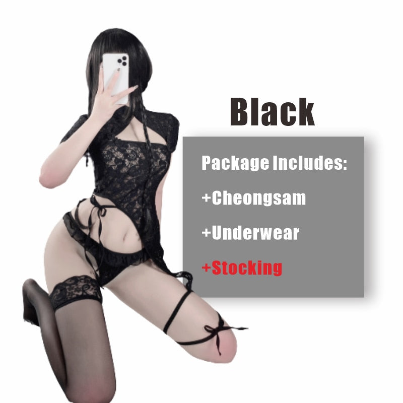 OJBK Sexy Lingerie Temptation Cheongsam Suit Chinese Qipao Uniform Lace Perspective Hollow out Charming Nightgowns Mini Dress