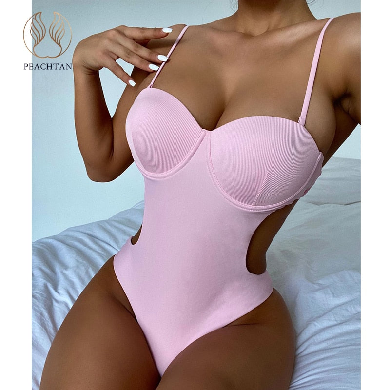 Peachtan Backless one piece swimsuit Solid swimwear female Sexy monokini Push up bodysuit 2021 Underwired bathing suit biquini