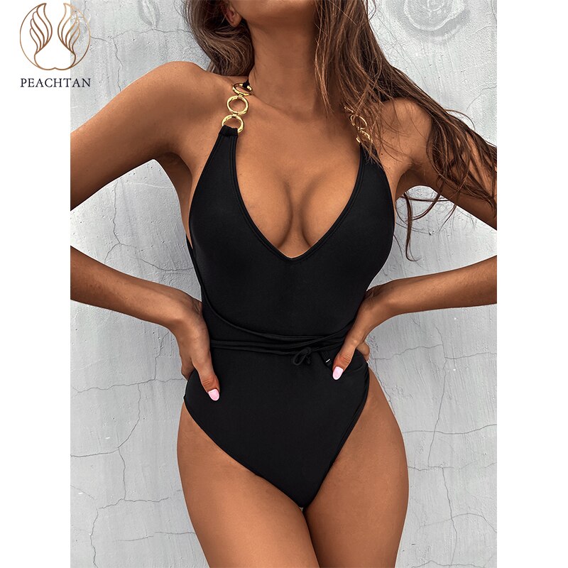 Peachtan Chain one piece swimsuit women V-neck swimwear female Solid monokini Lace up bodysuit Sexy bathing suit beach wear 2021