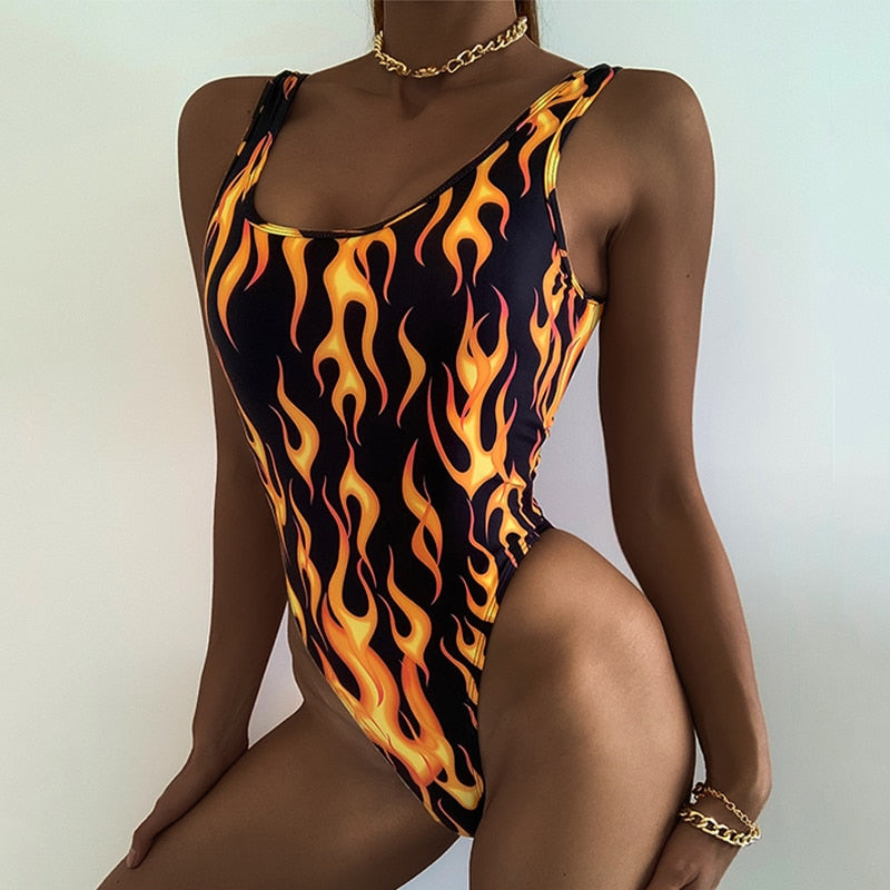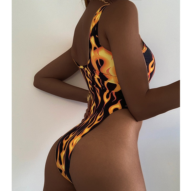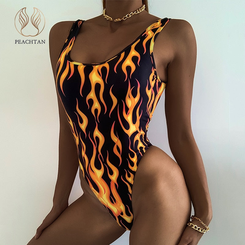 Peachtan Sexy one piece suit Yellow fire print swimwear women High cut retro monokini one-piece swimsuit female bathing suit new