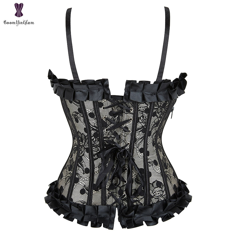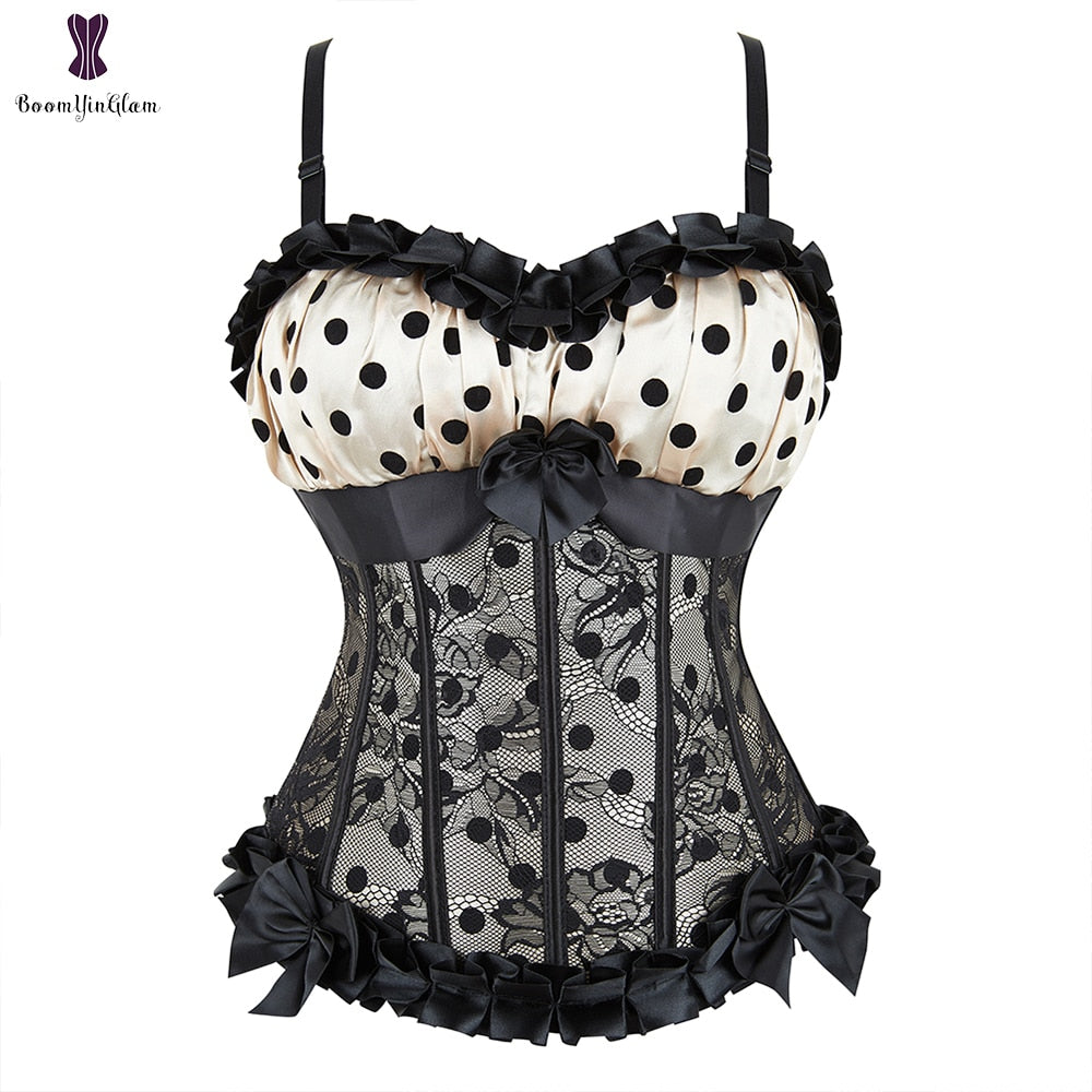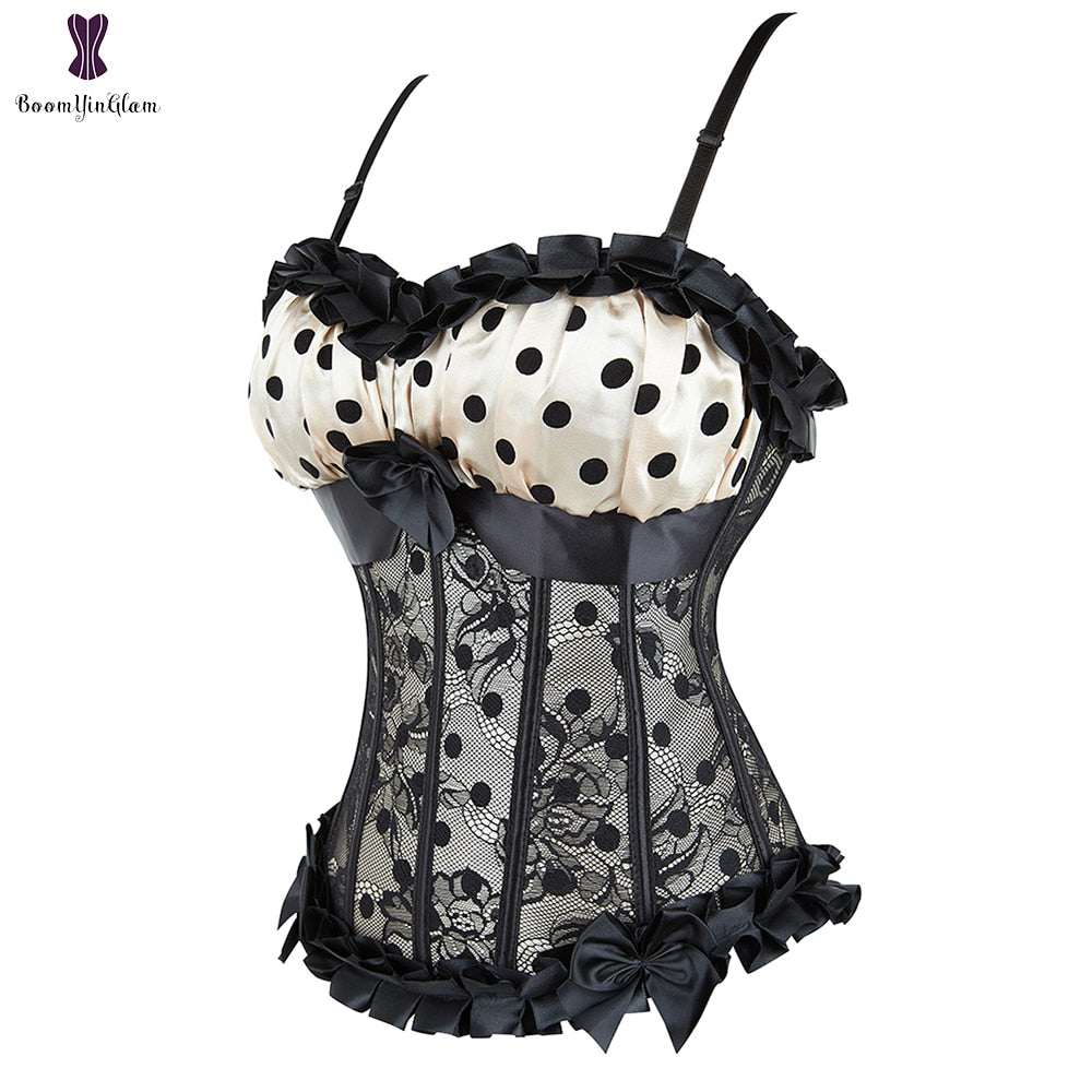 Removable Straps Side Zip Closure Overlay Lace Up Boned Corsets Ruffled Top Polka Dot Corset Bustier Overbust 8899#