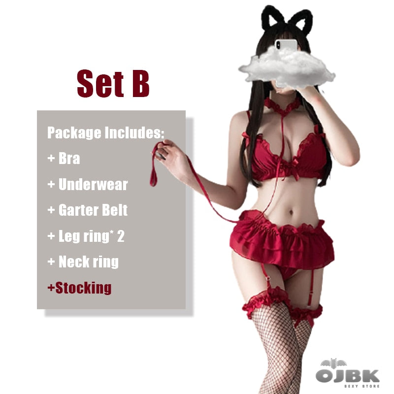 Sexy Lingerie For Women Red Chiffon Lace Underwear Erotic Outfit Couple Cosplay Costumes With Leadchain Bra Panties Set 2021 New