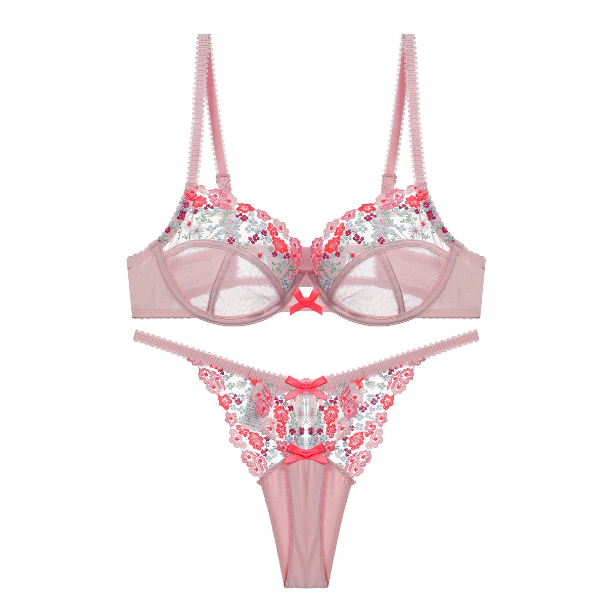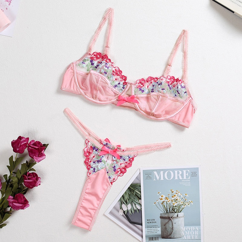 Sexy Pink Lace Underwear Set Embroidered Flower Bra Push Up Brassiere Mesh See-through Erotic Lingerie Women Thong Sets