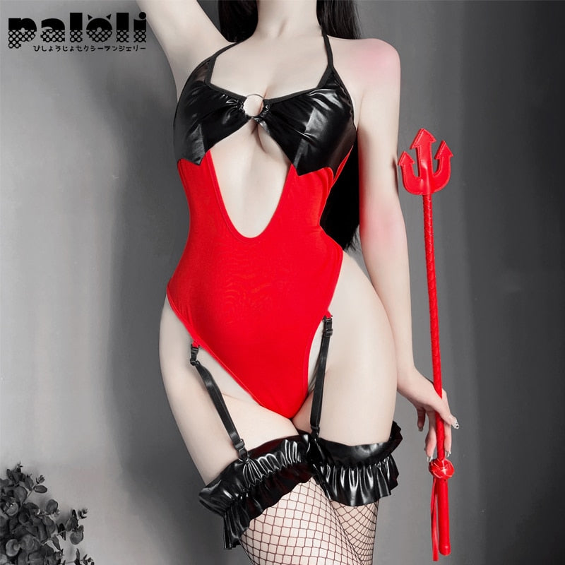 Sexy Succubus Cosplay Leather Lingerie Red Bodysuit Halter V-Neck Hollow Out Temptation Devil Comic Costumes Anime Outfit 2021