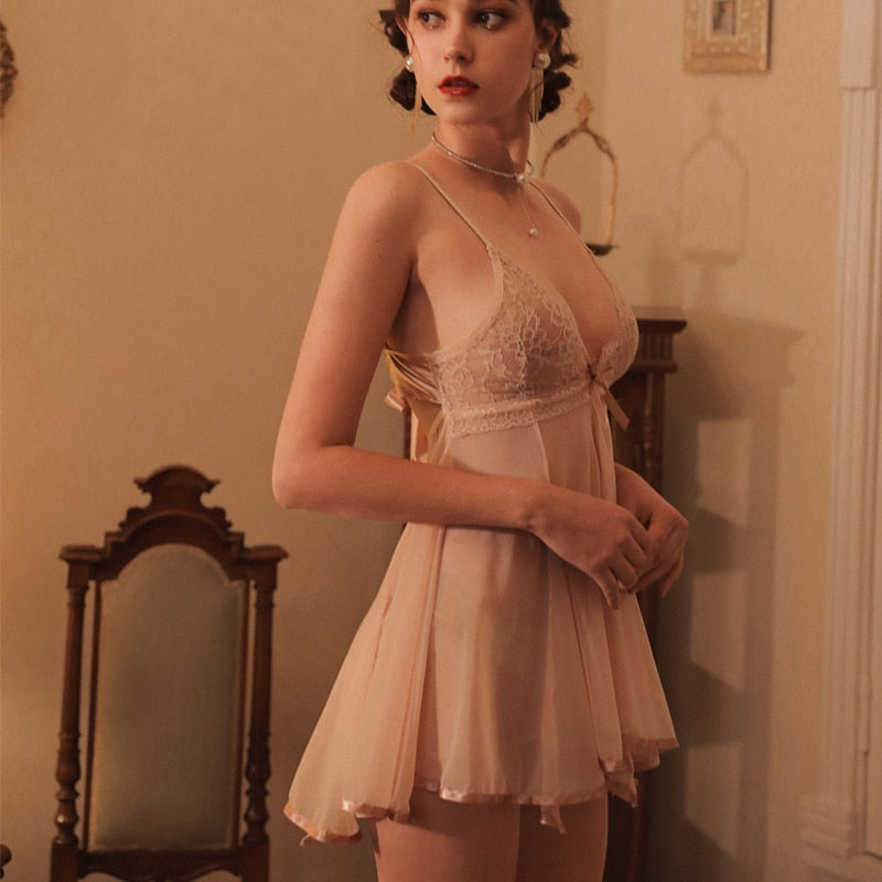 Summer Women Sleepwear Sexy Nightdress Lace-up Bow Beauty Back Sexy Nightgown Gauze Mesh Nightgowns with Panty Lingerie Dress