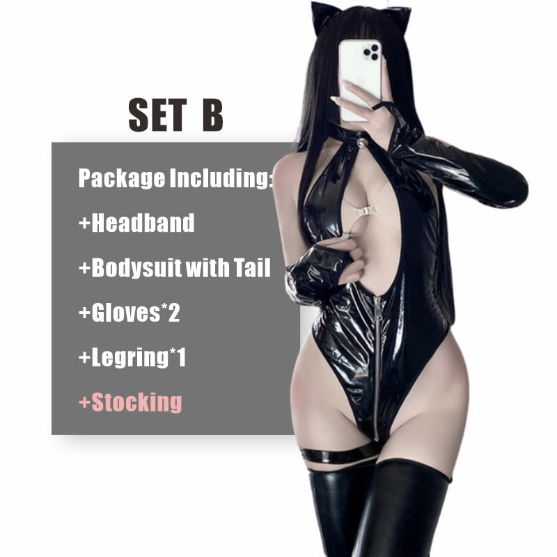 Women Shiny Metalli One Piece Leather Wetlook Zipper Crotch Leotard Bodysuit Sexy Lingerie High Cut Thong Teddy Bodysuit Catsuit