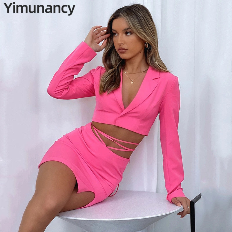Yimunancy 2-Piece Blazer Sets V Neck Cropped Blazer + High Waist Skirt 2021 Autumn Button Notched Lace Up Matching Set