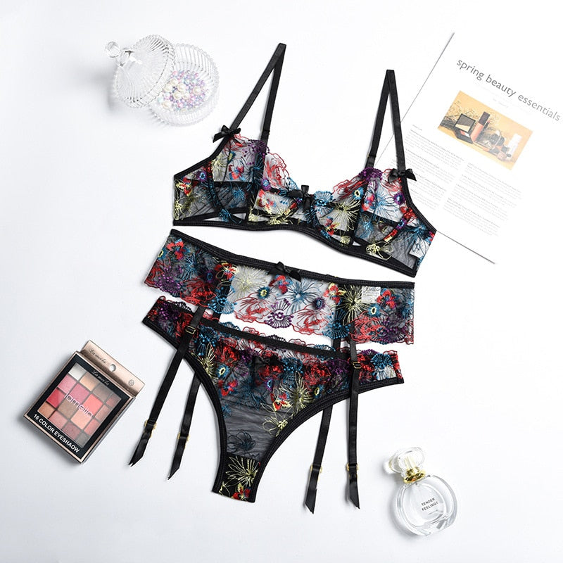 Yimunancy 3-piece Lace Bra Set  Lady Flower Embroidery Bra + Panty Set women's Sexy Underwear Set